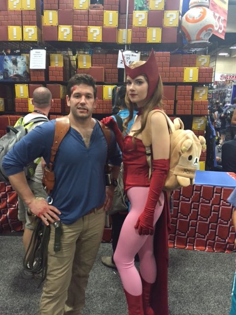 Attractive people cosplaying as Nathan Drake and the Scarlet Witch.