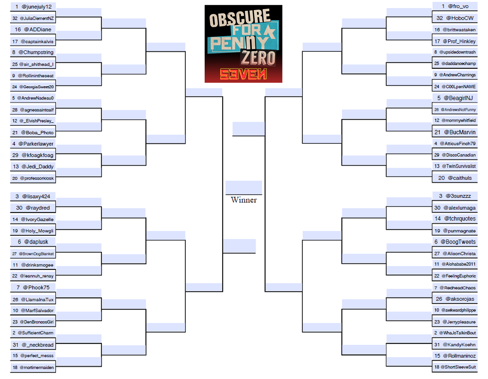 Contestants are initially seeded based on follower count, to do battle over the course of several rounds, each with its own unique topic or theme. All tweet matchups are judged anonymously based on the text of the tweets alone, by a diverse panel of judges including accomplished writers, artists and humorists from primarily outside of the Twitterverse.