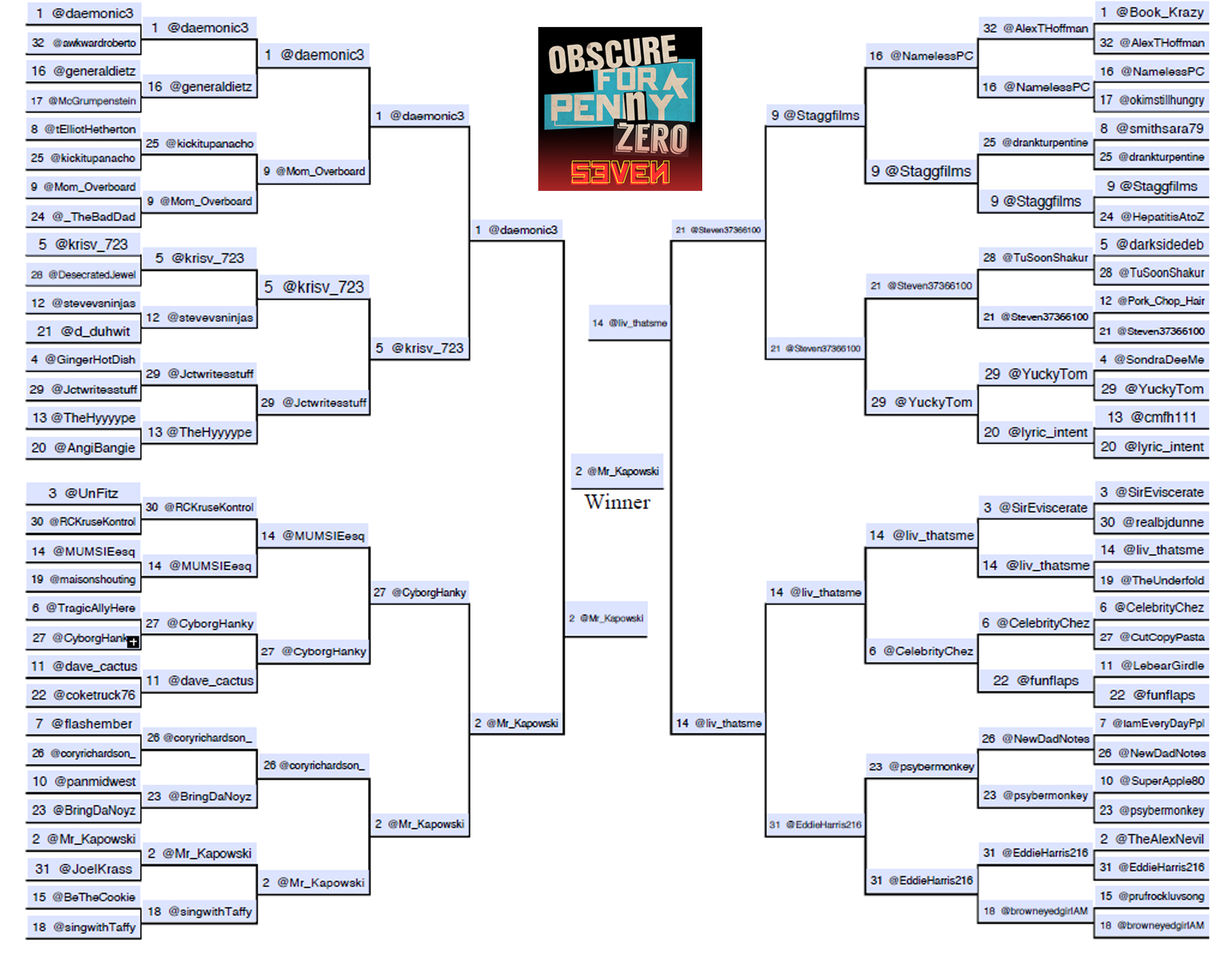 We began this journey with 128 brave and hopeful souls. After many rounds of competition, excruciatingly funny and original tweets and a couple that were just plain excruciating, two contestants now stand on the precipice. For one, this final round will mean legendary status, bragging rights, and a few cool limited-edition Obscure Entertainment prizes. For the other…hey, making it to 2nd Place out of 128 people in the toughest Twitter joke competition on this entire website is still pretty damn inspiring and brag-worthy.