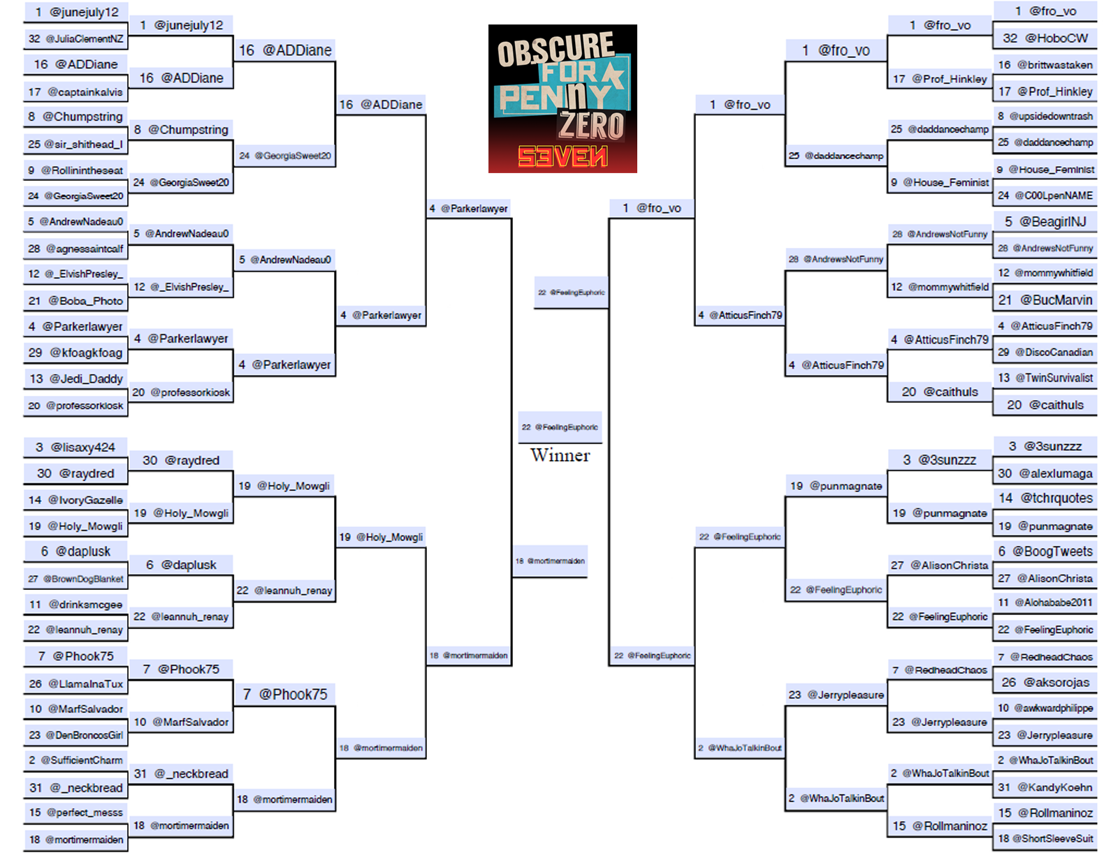 We began this journey with 128 brave and hopeful souls. After many rounds of competition, excruciatingly funny and original tweets and a couple that were just plain excruciating, two contestants now stand on the precipice. For one, this final round will mean legendary status, bragging rights, and a few cool limited-edition Obscure Entertainment prizes. For the other…hey, making it to 2nd Place out of 128 people in the toughest Twitter joke competition on this entire website is still pretty damn inspiring and brag-worthy.
